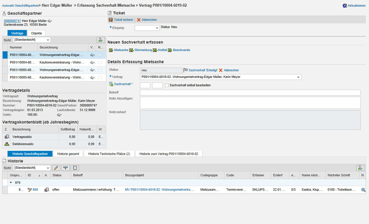 The CRM ticket system enables companies to restructure all of their business cases to fit a fundamentally customer-oriented process view. All customer processes receive a unique ticket number, which is retained for all sub-processes and parallel processes. A CRM Cockpit is available for creating the tickets. A ticket issued by the business partner is created and, depending on the customer’s concern (e.g. a complaint or reporting a defect), a suitable process is initiated automatically.