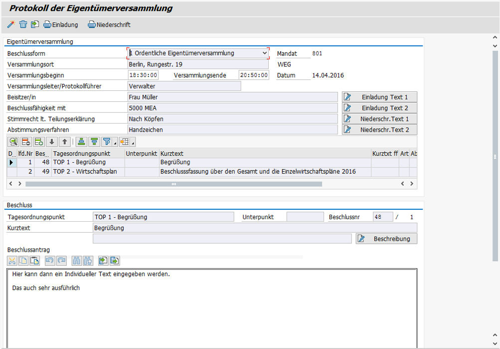 According to Section 24 Paragraph 7 of the WEG (German Condominium Act), it is mandatory for the owners to keep a record of decisions. As the condominium owners can make decisions that deviate from the statutory regulations or the content of the declaration of division, these decisions are not added to the land register. Thus, it is necessary to provide seamless documentation for third parties. The invitation to an owners meeting together with the agenda form the basis for the minutes and recording of decisions in COA management.