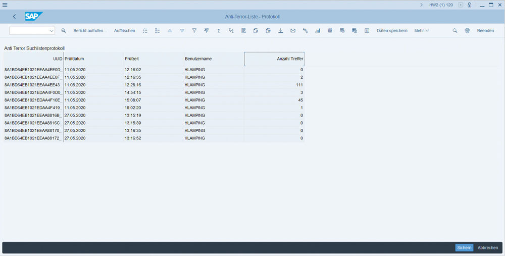 Firstly, the user can call up the relevant business partner using the individual case check and compare this partner to the sanctions lists for a possible match. The user then receives a list of hits in response to the query. This check is automatically logged and is permanently available in the SAP® system as evidence.