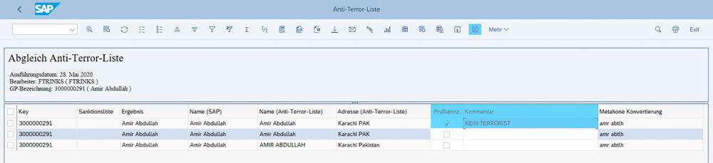 Firstly, the user can call up the relevant business partner using the individual case check and compare this partner to the sanctions lists for a possible match. The user then receives a list of hits in response to the query. This check is automatically logged and is permanently available in the SAP® system as evidence.