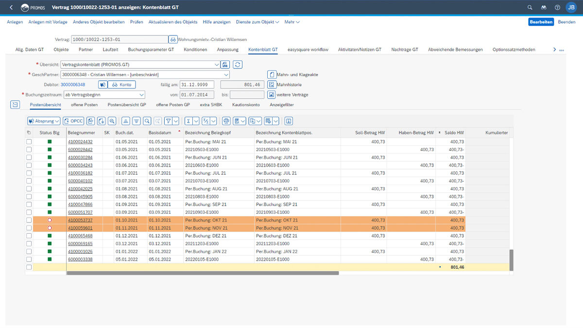 Time savings: The relevant data does not have to be manually compiled from various areas, which is extremely time-consuming, but can be found in the general real estate contract at a glance. In addition, the user can jump directly from the contract account sheet to other transactions.