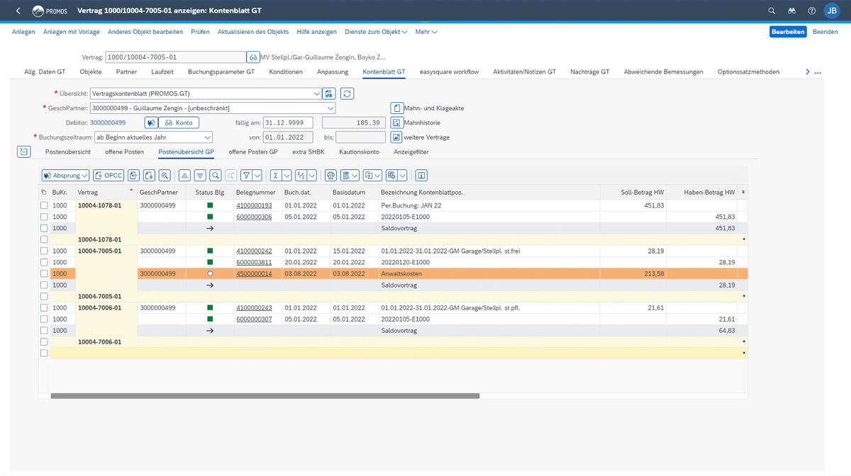 PROMOS developed the contract account sheet to allow you to access all the information relevant for accounting contained in the real estate contract with just a few clicks. Tailored to the individual requirements of the customer advisor and contract accountant, it provides an optimal overview of all contract-related account transactions, such as a list of open items or information regarding dunning and court cases. The item and balance development for the contract is presented clearly, and the tool provides rapid, flexible handling for handling the business processes necessary in contract accounting.