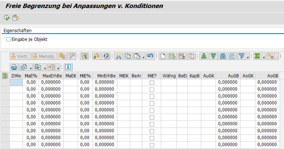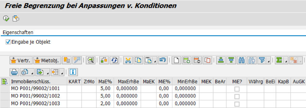 Generally, the PROMOS capping tool can be used for every adjustment method. For example, if a maximum increase amount of two percent is defined and the value that is calculated in accordance with the adjustment rule is greater than the upper limit compared with the old condition value, the adjustment is made to only this two percent of the upper limit. Maximum increase amounts per measurement (e.g. m²) or absolute maximum increase amounts (e.g. a max. increase of €10.00) can also be maintained.