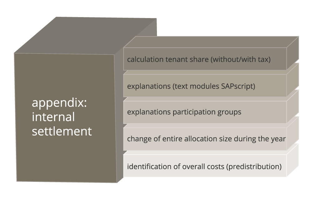 As well as the letter itself, creation of an “internal utility statement” is a key component of the modular utility statement letter. This not only contains modules for presenting the calculation of the tenant’s share (without/with tax), but also other areas that can be presented as integral components of the appendix or shown separately as an individual appendix. You can configure whether the areas are shown or hidden as well as the sequence in the customising in a flexible manner.
