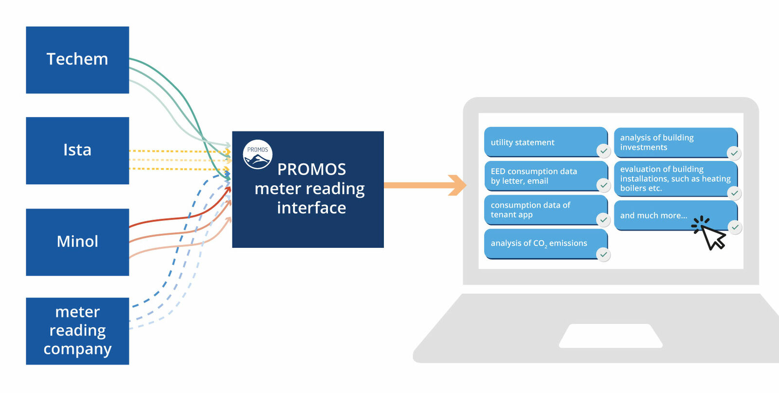 ![]() The PROMOS meter reading service interface builds the digital bridge between your service partners and your ERP system so that all information on consumption, costs and so on can be processed seamlessly – for example, for consumption data for your tenants throughout the year, utility cost statements or analyses of the energy efficiency of your buildings.    |