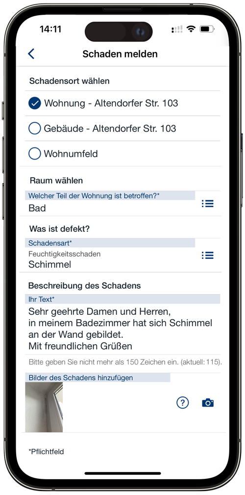 Tenants can report new damage or view past reports quickly and directly. A catalogue of damage reports – derived from the ERP system – makes it easier for tenants to enter them and to assign them within your housing company. Photos can also be added and tenants are always kept informed of the latest status through predefined status changes to the repair process.