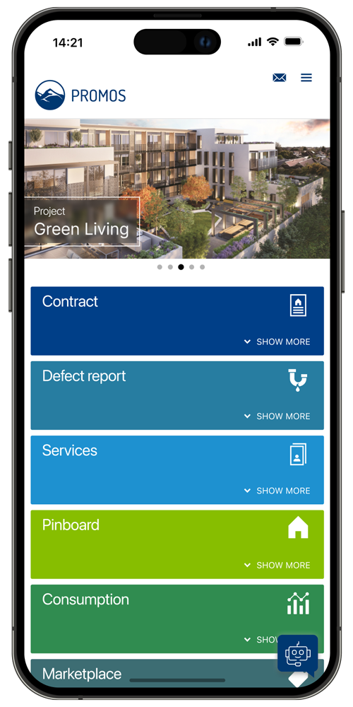 ![]() Overview of the services in the easysquare tenant app – completed by an optional chatbot function with our virtual assistant PROMi. |