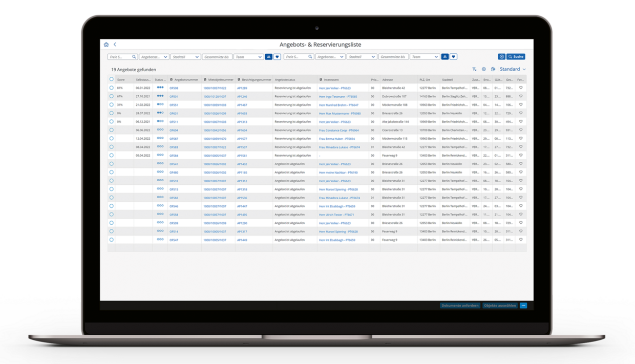 Matching: Various mechanisms, such as matching or scoring to assess the selected potential tenants, support the pre-selection process. Self-disclosures and SCHUFA reports are available in fully digitised form.