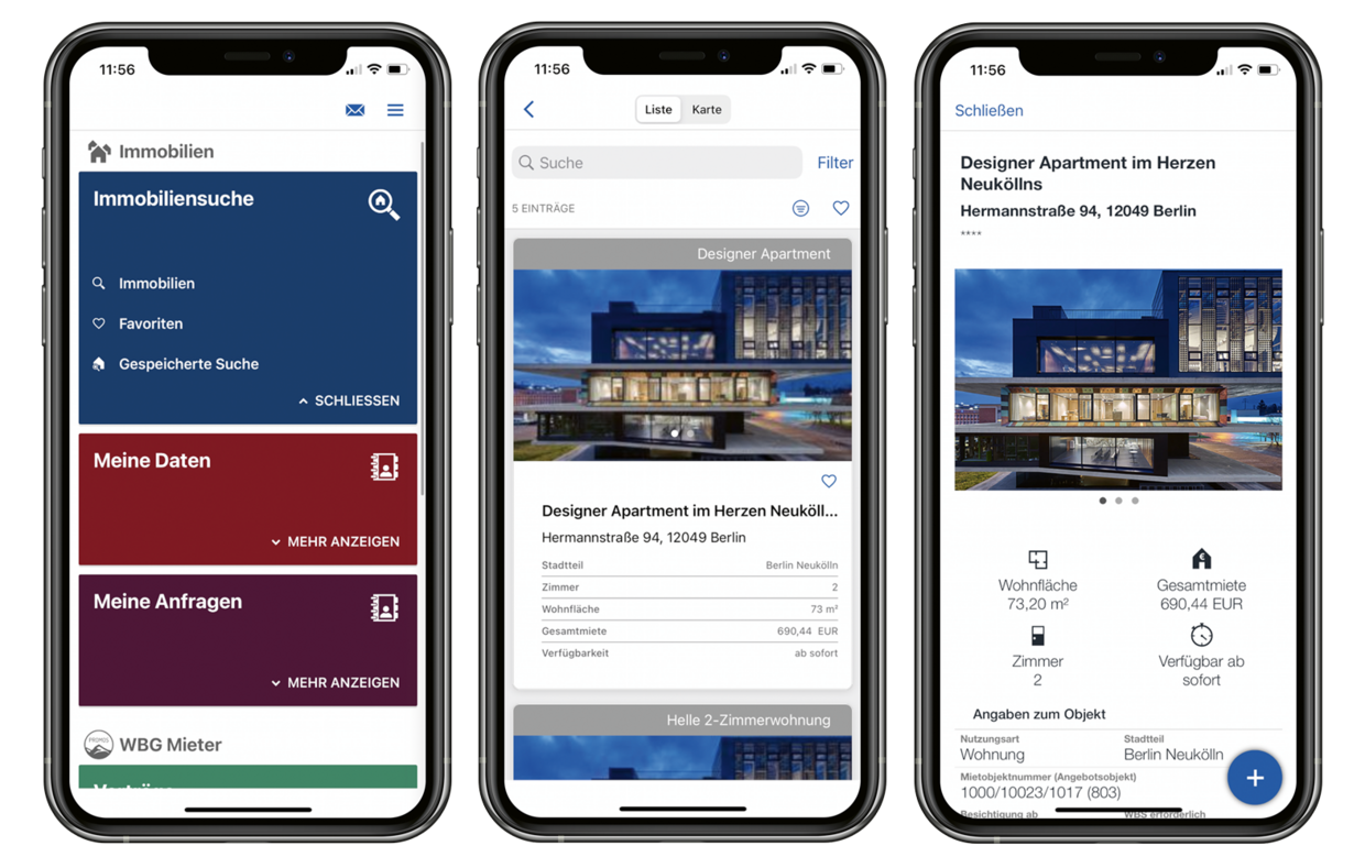 - Real estate search made easy: With the separate application, your potential tenants can view and enquire about available properties, search, arrange appointments, manage self-disclosure data and documents, store search profiles and send enquiries. The current status of an enquiry can be tracked at any time. All enquiries are channelled, as enquiries from external portals automatically trigger a request to register in the potential tenant app.