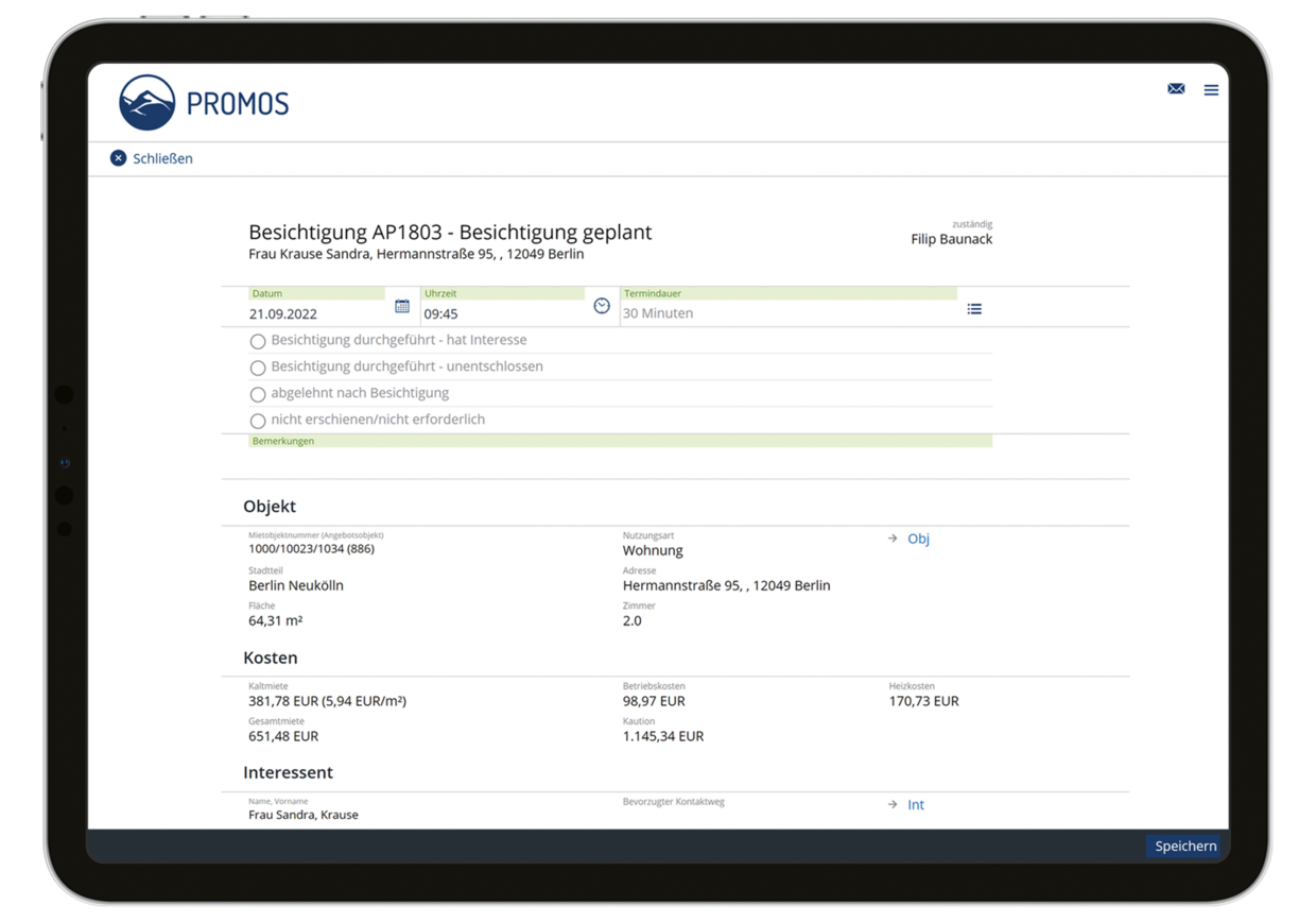 Time savings: Various features for mass processing and the use of the potential tenant app allow work steps to be digitalised and simplified in order to save significant time and costs. Being able to simply select from a huge number of enquiries makes work much easier. No redundant entries are required at any point in the process. All master data is transferred automatically, including all relevant data on the property, potential tenant and conditions when the rental agreement is concluded.
