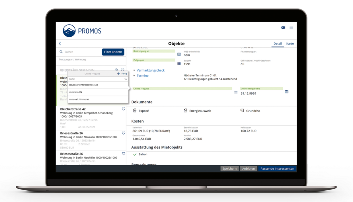 Digital marketing: With just a few clicks, you can initiate the marketing of your properties via various channels, such as the potential tenant app or external portals (ImmoScout, Immowelt, classified ads, etc.). The property data is transferred in a structured form and no longer needs to be entered manually.
