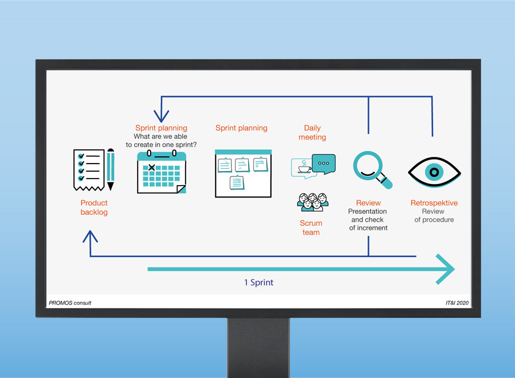 The framework is based on Scrum roles – the division of roles into Product Owner, Developer and Scrum Master – as well as on recurring Scrum meetings that take place within a fixed framework, including sprints, planning meetings and daily meetings. Finally, we have the Scrum artefacts and typical terms familiar to all project participants, such as the Product Backlog, Sprint Goal and Product Goal. The combination of structure, transparency and agility has already proved to be highly effective in many complex projects, as even small-scale projects can be processed efficiently and in an organised manner.