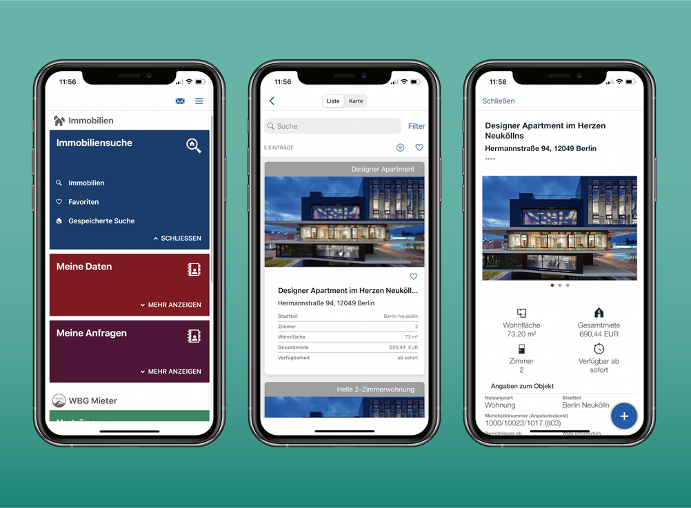 Figure 2: Apartment search made easy! In the app, customers can search for properties, send enquiries for properties and also book available slots for viewings themselves. This allows you to significantly reduce your administrative workload.