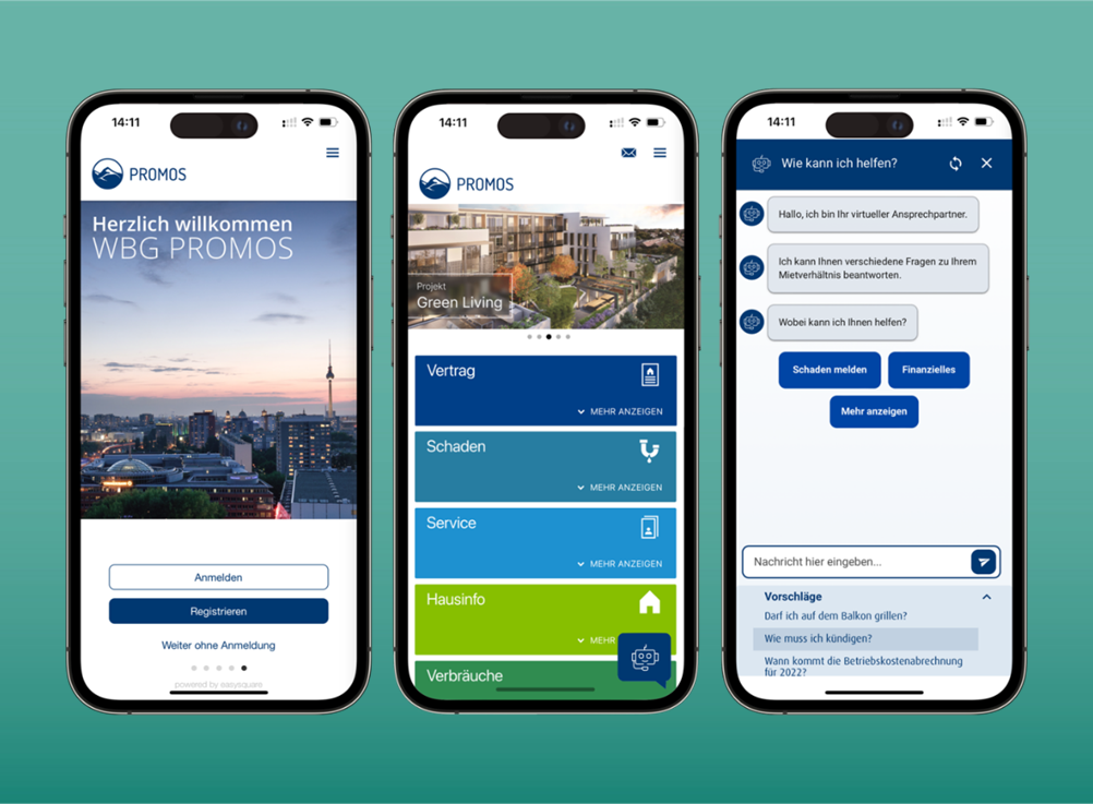![]() Figure 1: Tenants can use a wide range of services in the easysquare tenant app. Our virtual assistant PROMi is also available as an option for simple enquiries via a chat function. |