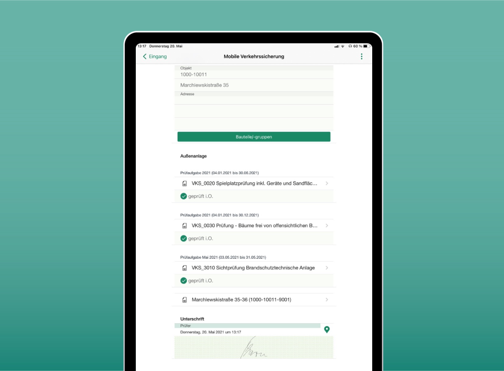 The signature on the digital inspection forms is stored in an audit-proof manner and provided with geo-data from the mobile device at the time of the signature.